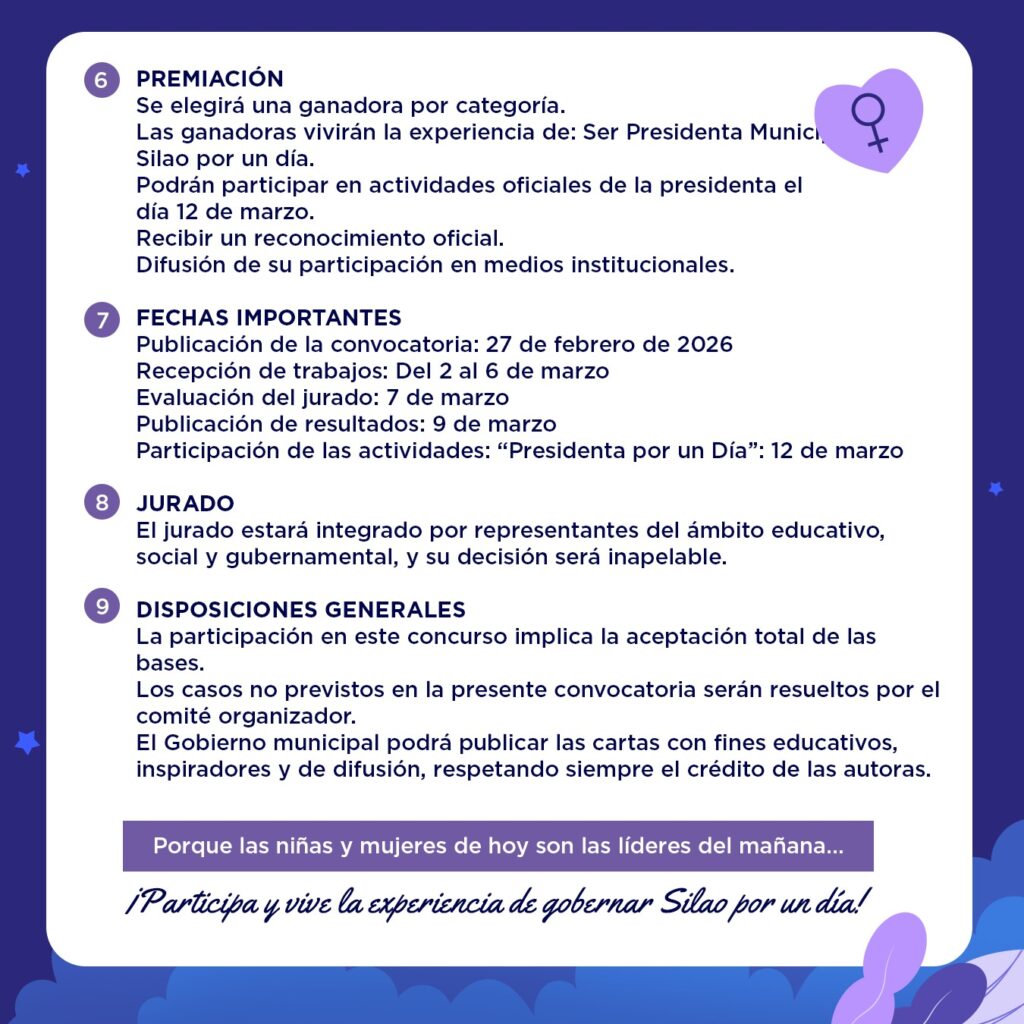 Las participantes deberán elaborar una carta escrita a mano con una extensión de una cuartilla o 350 palabras con el tema “¿Qué haría yo si fuera Presidenta Municipal de Silao?”. El documento deberá incluir una propuesta para mejorar la ciudad y explicar la forma de aplicarla.