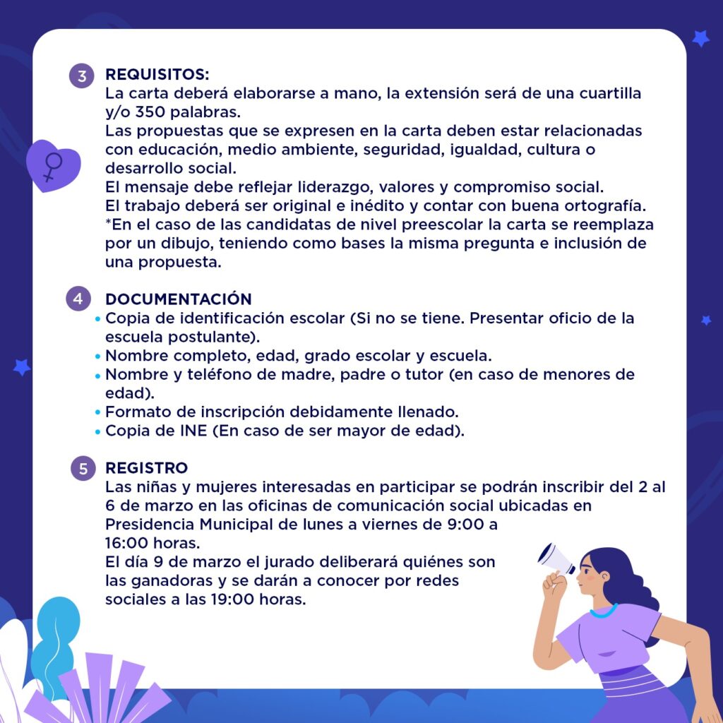 Podrán participar alumnas de instituciones educativas públicas y privadas de los niveles preescolar, primaria, secundaria, preparatoria y universidad. También podrán registrarse mujeres adultas mayores que residan en el municipio.
