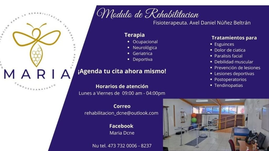 Durante 2026, MARIA ofrece terapia ocupacional, neurológica, geriátrica y deportiva. Los servicios atienden esguinces, dolor de ciática, parálisis facial, debilidad muscular, prevención de lesiones, lesiones deportivas, tratamiento postoperatorio y tendinopatías. El costo por sesión es de 200 pesos, con posibilidad de atención gratuita tras valoración en casos de vulnerabilidad social.