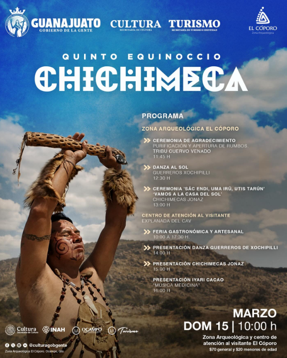 Ocampo, Gtpo.— El Quinto Equinoccio Chichimeca Ocampo 2026 se realizará el domingo 15 de marzo en la Zona Arqueológica El Cóporo, en la comunidad de San José del Torreón. El evento tendrá un horario de 10:00 a 17:30 horas. El acceso tendrá un costo de 70 pesos para público en general y 20 pesos para menores. Los organizadores recomiendan asistir con vestimenta blanca y usar calzado cómodo.